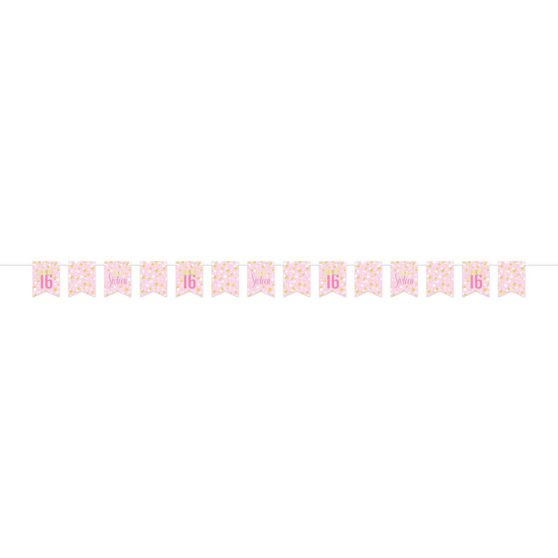 Brighten up her special day with this Sweet 16 Streamer. This printed cardstock streamer features flag shaped pieces with a pink background and white and gold circle confetti. Some have no text, some have "Sweet Sixteen" and others have "Sweet 16" in gold and darker pink lettering. Assembly required. Measures 6in x 8ft.