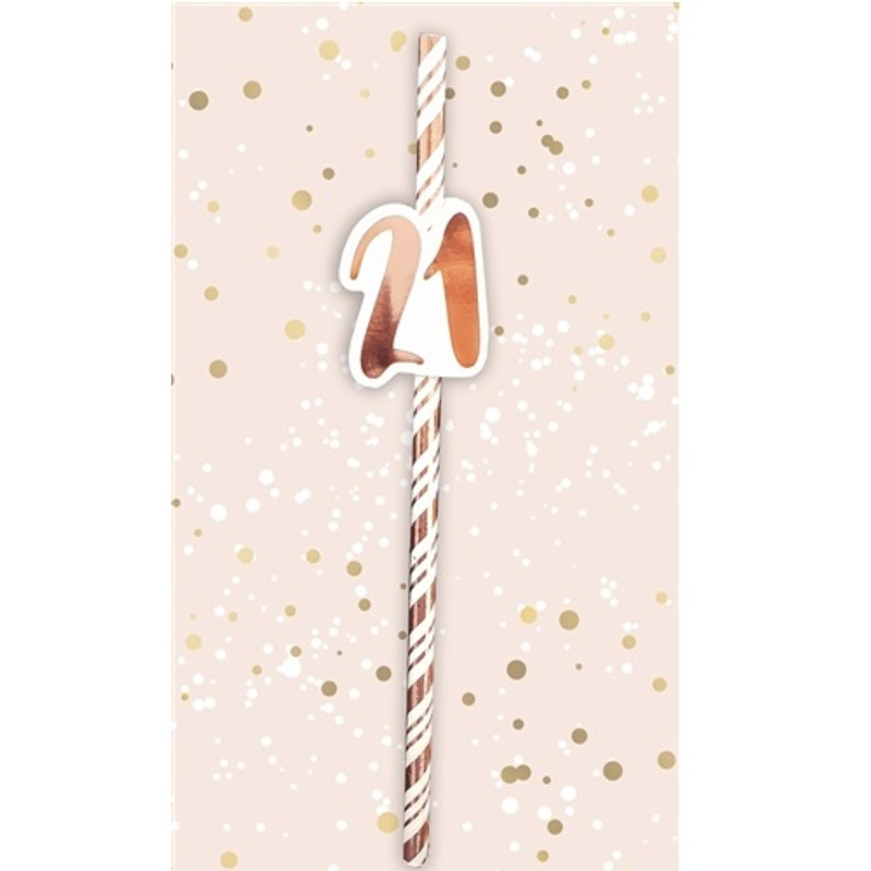 These 21st Birthday Rose Gold Straws make great party drink decorations! These white paper straws feature metallic rose gold spiral stripes with a metallic rose gold 21 attachment. Package includes 6 7.75in straws.