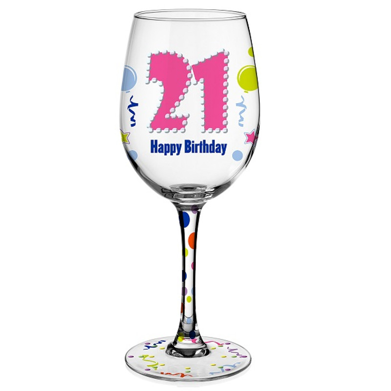 Celebrate becoming legal with some birthday wine in this 21st Birthday Wine Glass! This wine glass features a hand painted design with jewel accents and "21 Happy Birthday" in pink numbers and blue letters. Holds up to 15oz.