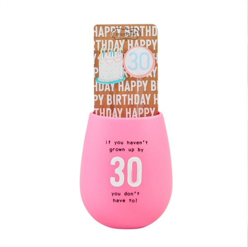 Sip and celebrate another year older with this 30th Birthday Silicone Wine Set! This set features a 12oz stemless silicone wine glass with a fun printed phrase and 2 6in acrylic drink stirrers with decorative toppers.