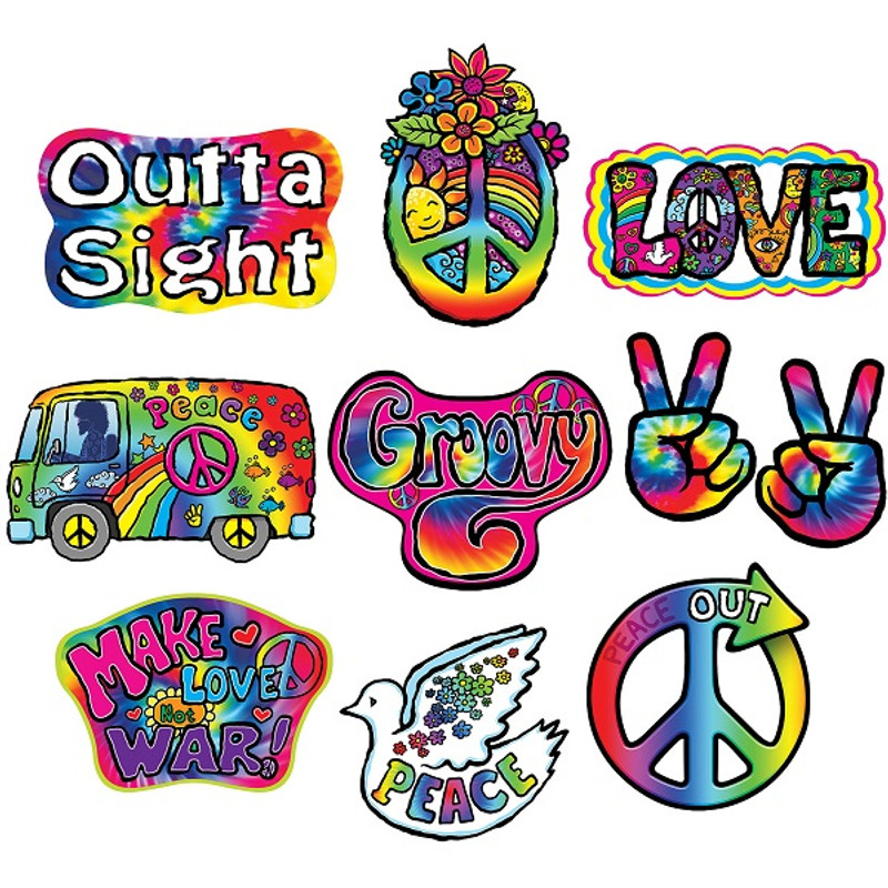 These 60's Cutouts are outta sight! These colorful cardstock cutouts feature tie dyed designs with fun 60s phrases and symbols. Package includes 10 7.5in to 12.25in cutouts.