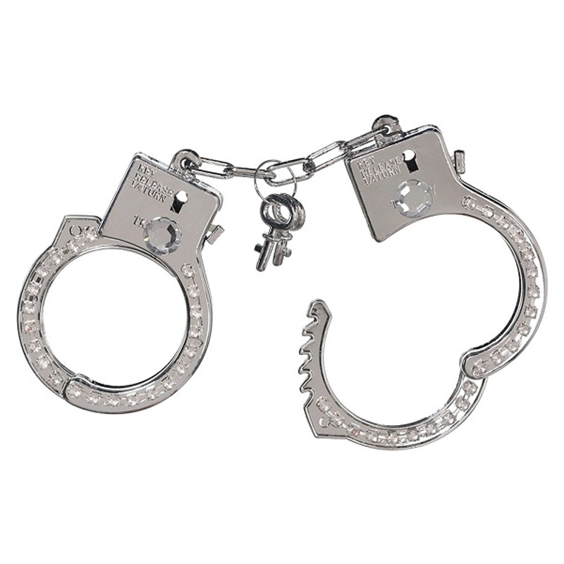 Add some bling to your cop or prisoner costume with these Rhinestone Handcuffs! These silver plastic cuffs features a sparkling faux rhinestone design and includes 2 keys. One size fits most.