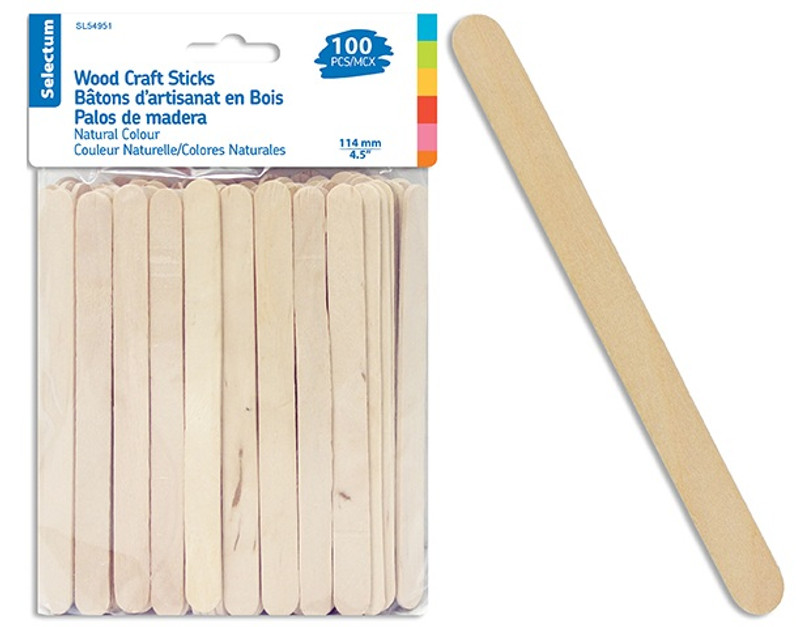 Use these Wooden Sticks to help you create fun crafts! These natural color wooden sticks are great for all sorts of creative projects. Package includes 100 count 4.5in sticks.