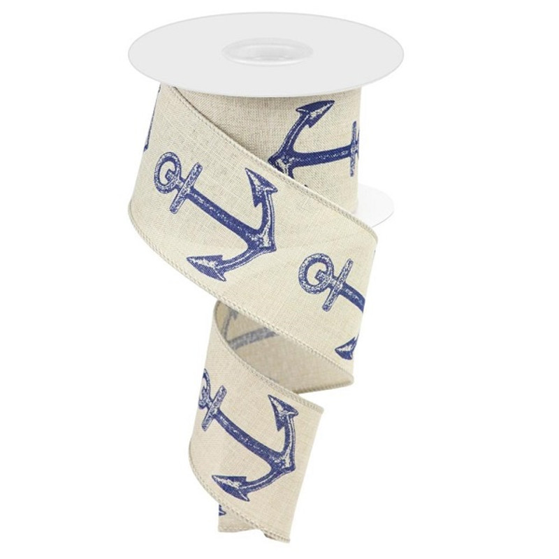 Create outstanding nautical themed wreaths and more with this Anchor Ribbon! This natural ribbon features vintage blue printed anchors with matching natural borders. Measures 2.5in x 10yds.