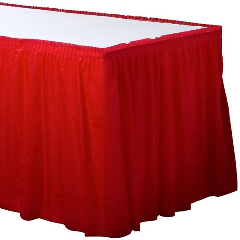 Make your party table stand out with this Apple Red Plastic Table Skirt! This durable plastic skirt features a self-adhesive backing to hold it in place. Measures 29in x 21ft.