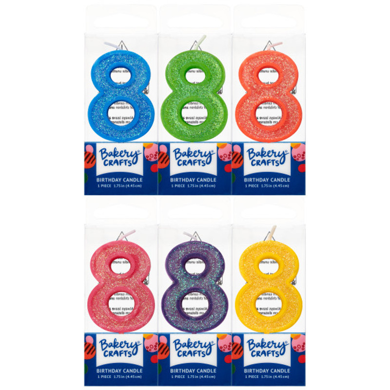 Light up the birthday cake in sjimmering style with these Assorted Mini Glitter Number Candles! From 0 to 9, combine to create any age. Includes 1 random chosen color 2.75in candle.