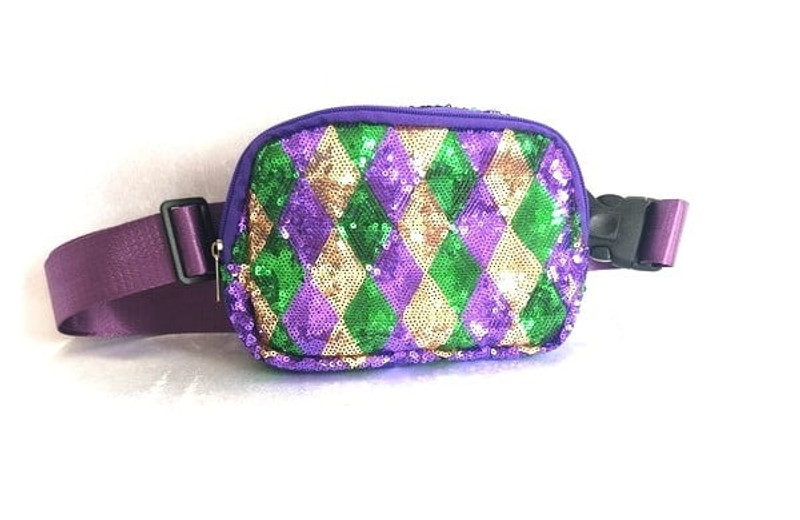 The Two Way Harlequin Bag is a shimmery, versatile accessory perfect for Mardi Gras celebrations. Featuring a sequin diamond pattern in purple, green, and gold, this bag sparkles with festive charm. It's purple adjustable buckle strap allows a secure fit for most. The bag itself measures 8in x 6in.