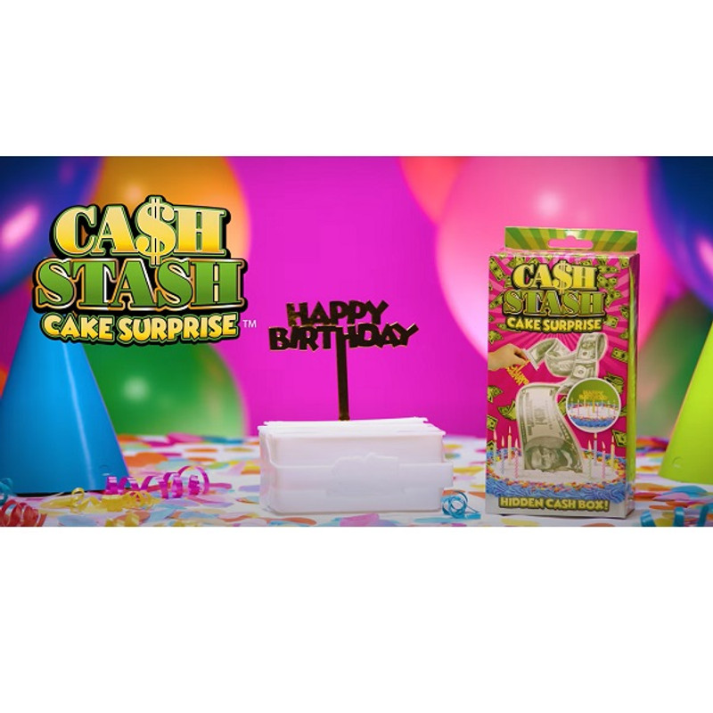 Spice up your gift giving with this unique Cash Stash Cake Surprise! Package includes 1 cash stash box, 1 cake cutting tool, 1 roll of 50 perforated plastic sleeves, 1 “Happy Birthday” cake topper, and 1 card clip cake topper. Cash not included.