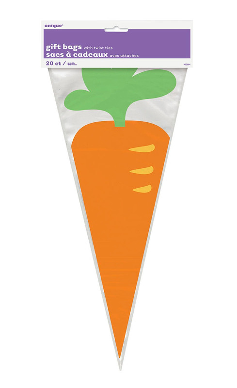 Fill up these Carrot Cone Cello Treat Bags with Easter treats and candy! These clear plastic bags feature printed orange carrots with green leaves. Package includes 20 count 15.25in x 6.5in bags along with silver twist ties.