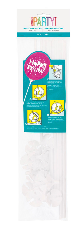 Create your own balloon centerpieces for any special occasion with these white Balloon Sticks and Cups! Stick the tail of the balloon through the cup and attach it to a stick. Package includes 20 count sticks measuring 16in with cups.