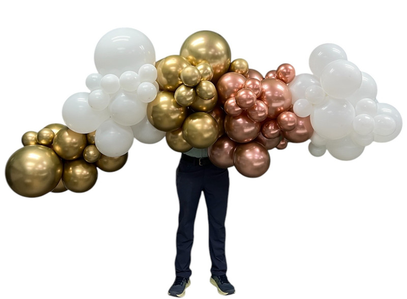 Make your event unforgettable with our beautiful balloon garland, featuring 5-inch, 12-inch, and 18-inch balloons in chrome rose gold, chrome gold, and white—perfect for birthdays, weddings, and more.