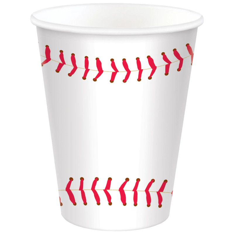 Bring the game to the table with these festive Baseball Paper Cups. These white paper cups have red lines mimicking the laces of a baseball. They’re perfect for sports-themed birthdays, team celebrations, or watch parties. Package includes 20 count cups measuring 12oz, 4.4in tall.