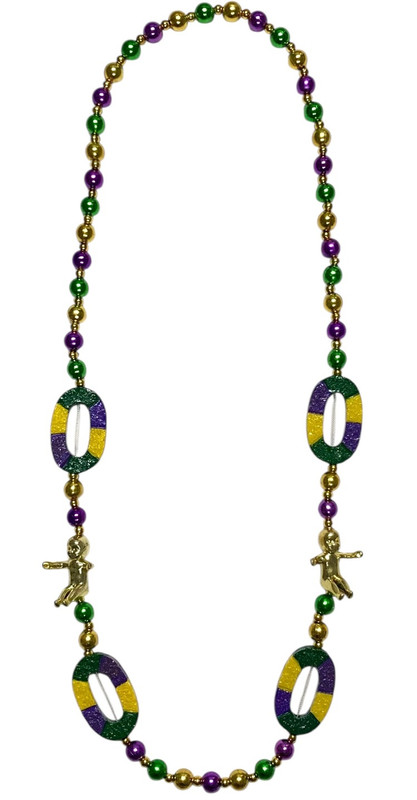 Celebrate Fat Tuesday when you wear this King Cake Baby Bead Necklace! This metallic purple, green, and gold beaded necklace features shapes of king cakes as well as metallic gold babies One size fits most.