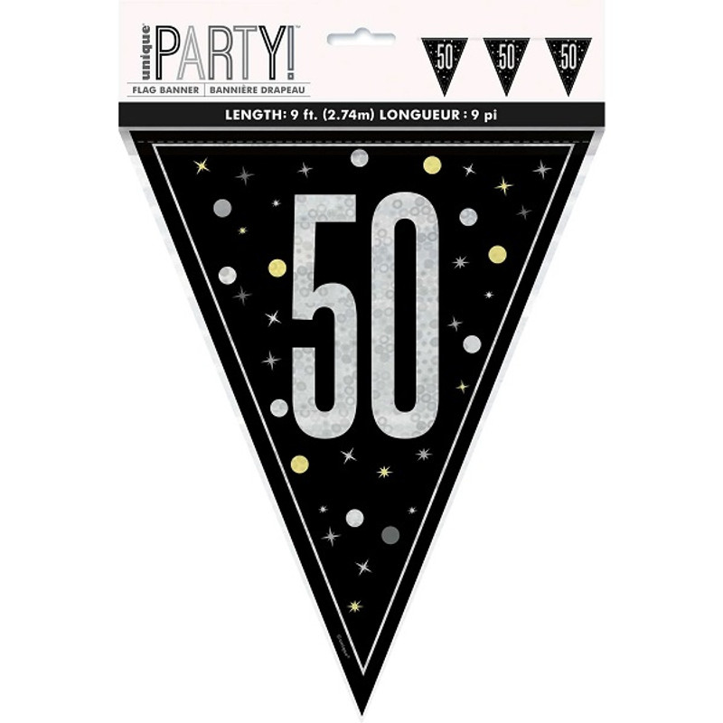 Add some sparkle to your 50th birthday celebration with this Birthday Glitz 50 Flag Banner! This decorative banner features black plastic pennant flags with a silver prism 50. Measures 9 feet.