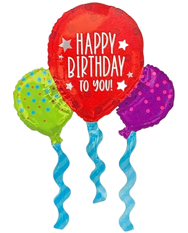 This Balloon Cluster Balloon is perfect for colorful themed birthdays! This is a shaped balloon with a large red balloon in the middle and smaller green and purple balloons on the sides, all with dotted confetti and blue ribbon shaped tassels. The red balloon features silver stars around "HAPY BIRTHDAY TO YOU!" in white text. Balloon is approximately 39 inches after inflation.