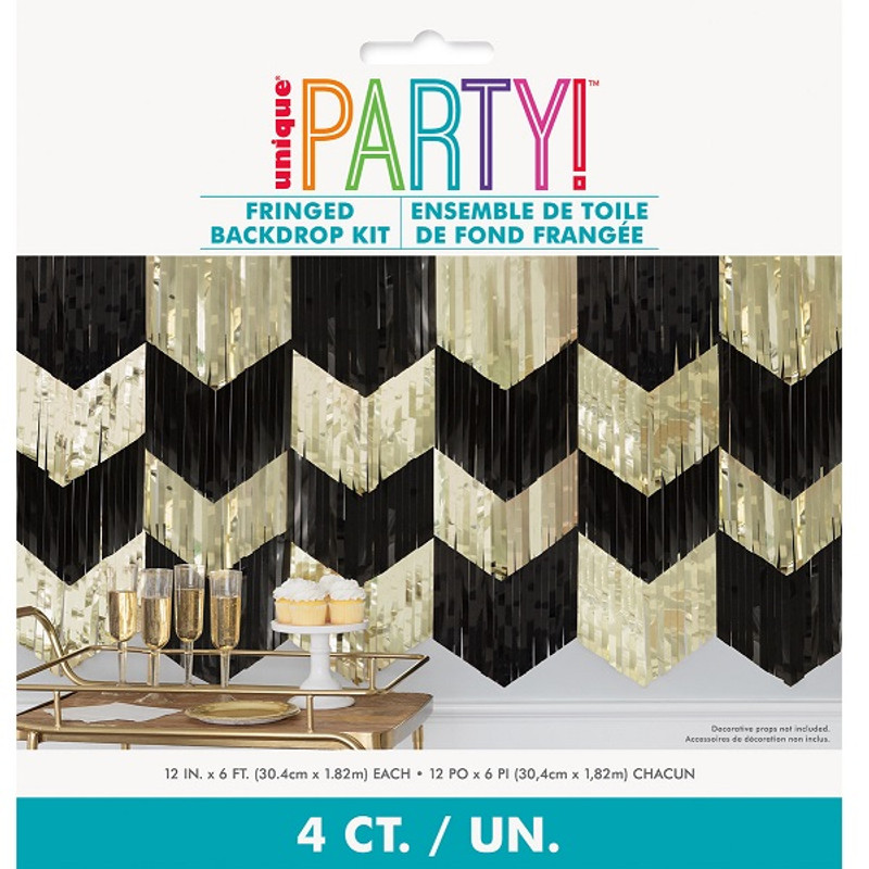 Glitz up your celebration décor with this Black & Gold Fringed Backdrop Kit! This kit features banners with a black and gold metallic fringe design. Package includes 4 12in x 6ft fringe banners.