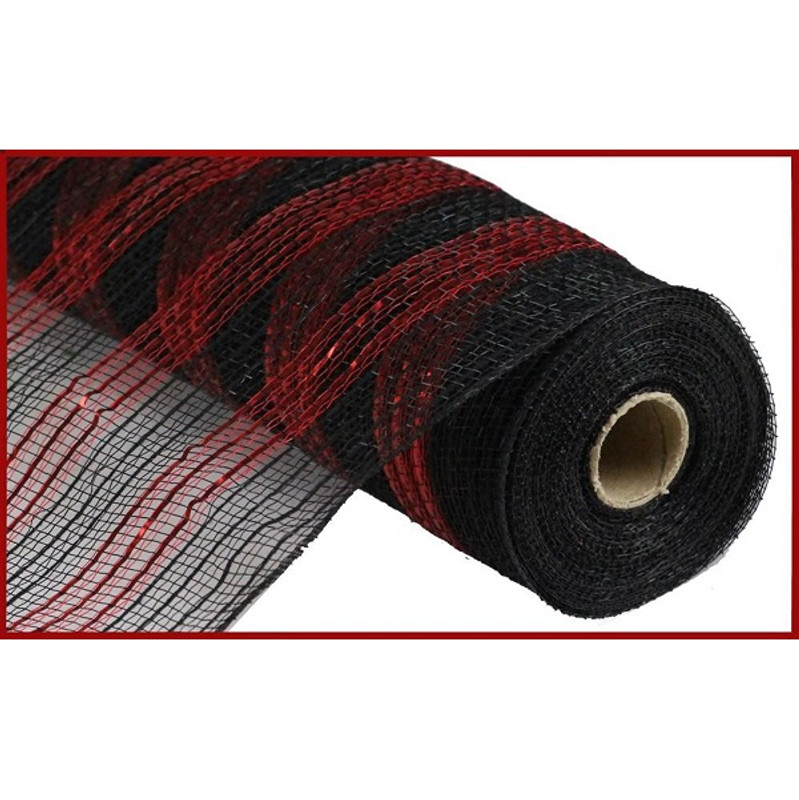 Add some modern flair to your Christmas wreaths and bow with this Black & Metallic Red Mesh! This mesh features a shiny red and black stripe pattern. Measures 10.25in x 10yds.