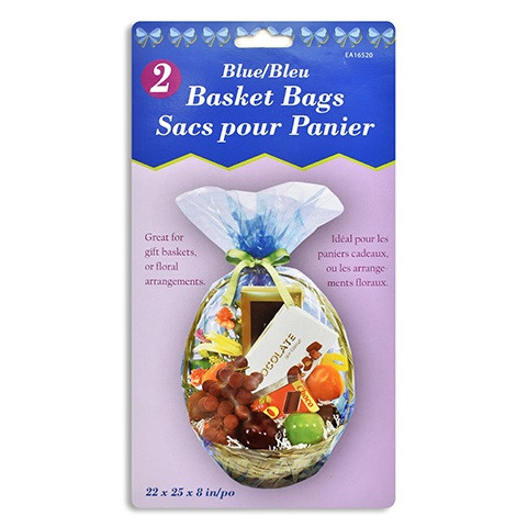Wrap up your Easter baskets and more with these Blue Cellophane Basket Bags! These blue tinted plastic cellophane bags are great for gift baskets and floral arrangements too! Package includes 2 22in x 25in bags.