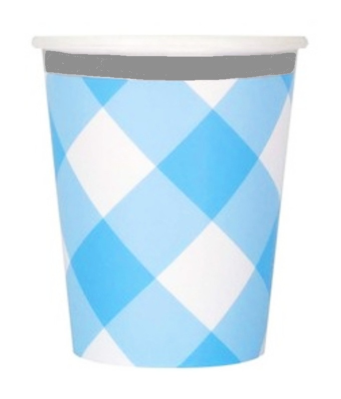 These Blue Gingham Paper Cups are perfect for serving your little one's 1st birthday party drinks! These paper cups feature a blue and white gingham design with a dark grey border. Package includes 8 count 9oz cups.
