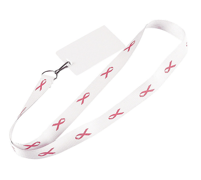These Breast Cancer Awareness Lanyards make for good giveaways at fundraisers and events. These white lanyards feature repeating pink ribbons, with a metal clip. Package includes 1 count lanyard measuring 32in, badge not included.