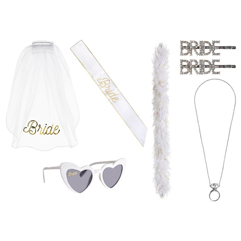 Description Give the new bride a fun gift with this Bride Kit! Package includes a pair of glasses, a veil, 2 hair clips, a sash, a ring necklace, and a boa. One size fits most. Additional Details SKU: PT_0192937324561