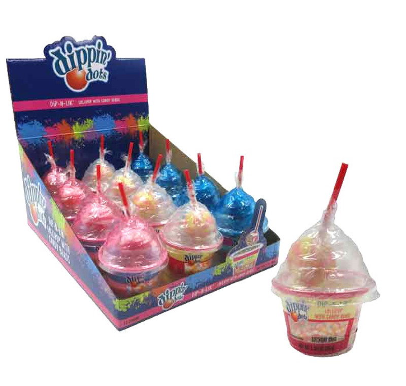 Get ready for a flavor-packed treat with the Dip N Lik Dippin’ Dots Cup! This fun, candy-filled experience combines a tasty lollipop with colorful candy bits. Available in three flavors: Strawberry, Birthday Cake, and Cotton Candy. Desired flavor not guaranteed. Package includes 1 count cup. Net WT 1.34in.