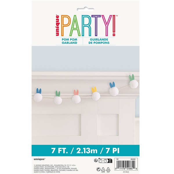 Add a cute look to your Easter decorations with this Bunny Ears Pom Pom Garland! This decorative garland features white pom poms with blue, green, pink, and yellow felt bunny ears. Measures 7ft.