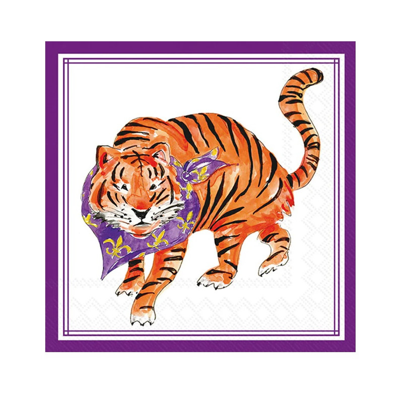 Bring the spirit of LSU to your celebration with the Prowling Tiger Beverage Napkins. These white 3-ply paper napkins are bordered with dark purple trim and feature a tiger sporting a purple bandana decorated with a yellow fleur-de-lis. Package includes 20 count napkins measuring 4.75in when folded.