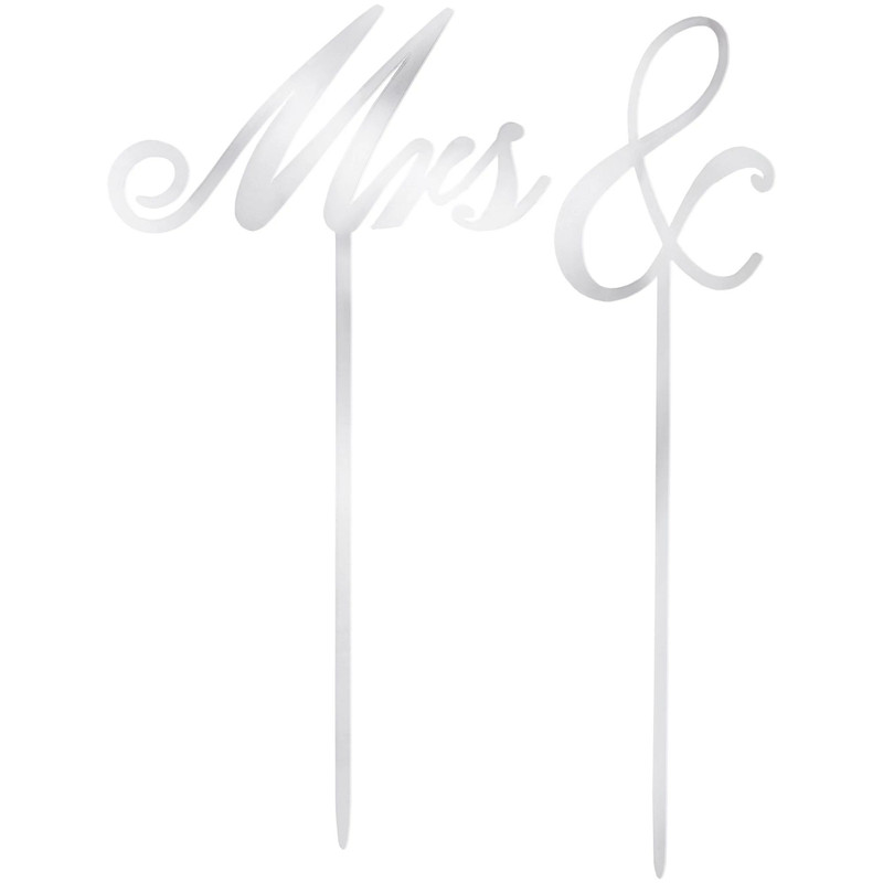 Dress up your wedding cake with this Mrs & Silver Cake Topper! These acrylic cake toppers have a silver finish, one saying "Mrs" and another as simply an "&" so that they can be combined with another set, displayed on the cake as needed. Package includes 2 count picks measuring about 6.5in.