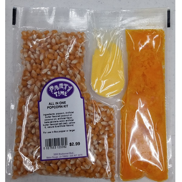 Make terrific popcorn every time with this All In One Popcorn Kit! This complete popcorn kit features oil, popcorn, and seasoning. For use in 8oz to 10oz poppers. Net WT 10.6oz.