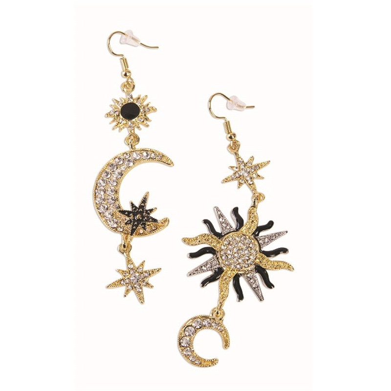 Add some sparkle to your celestial goddess costume with these Celestial Earrings! These pierced hook, dangling earrings feature a goldtone look with moons, suns, and stars decorated with faux jewels. Package includes 1 pair of 3in earrings. These earrings look amazing with this Star Headpiece and Celestial Midnight Maven Wig or this Sun Headpiece and Celestial Sunburst Wig!