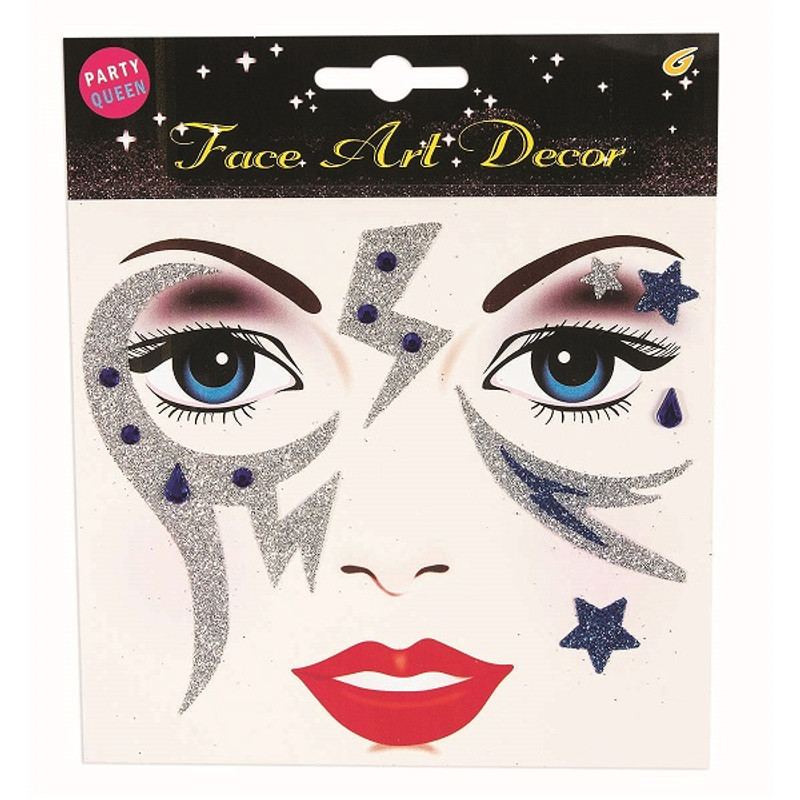 Give yourself a mesmerizing look for Halloween with this Celestial Silver & Blue Face Decoration! This decoration features glittery silver and blue face stickers with star, tear drop, and lightning bolt shapes. Great for witch costume, fairy costume, and more!
