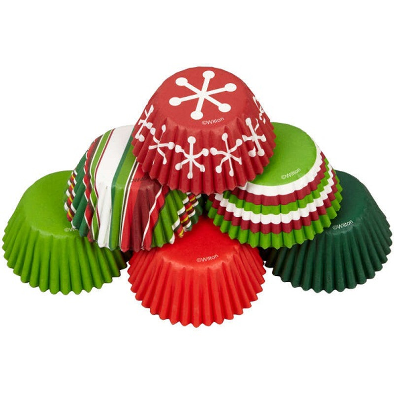 Dress up your holiday cupcakes in colorful style with this Chic Christmas Mini Baking Cup Assortment! These small paper baking cups feature assorted solid and patterned red, green, and white designs. Package includes 150 1.25in mini baking cups.