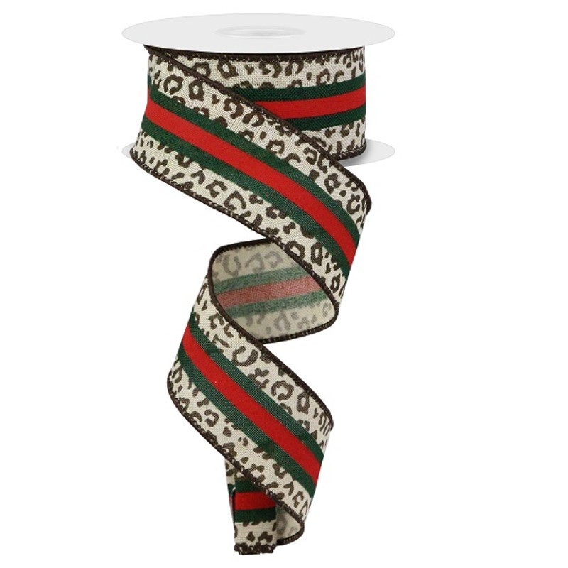 Create a wild holiday look for your wreaths and decorations with this Christmas Leopard Print Ribbon! This ribbon features green and red stripes with a classic leopard print and brown borders. Measures 1.5in x 10yds.