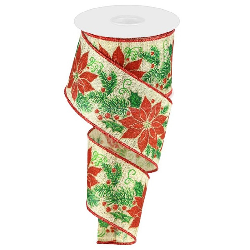Add some classic shimmer to your holiday wreaths and more with this Christmas Poinsettia Pine & Berries Ribbon! This gold ribbon features red poinsettias, green pine needles, and red berries with red tinsel borders. Measures 2.5in x 10yds.