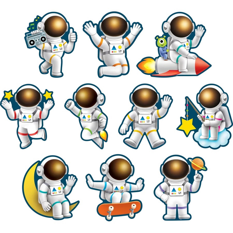 These printed cardstock cutout accents can make your classroom decor or school project more dynamic. These Outer Space Crew Astronauts are in various poses, some with accessories such as a boom box, rocket ship, or fishing pole. Package includes 30 count cutouts total with 10 count different designs measuring about 6in.