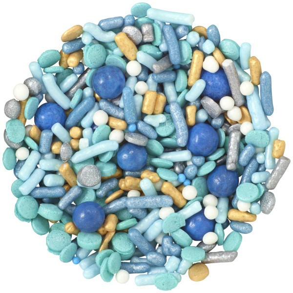 Add some sparkle to your treats with the Seaside Fusion Sprinkle Mix. This blend features a mix of jimmies sprinkles, quins, nonpareils, pearls, and sanding sugars in a color scheme of blue, light blue, dark blue, teal, white, silver, and gold, with a touch of shimmer. Perfect for baby boy showers, mermaid parties, or any blue themed celebration. Color variations may occur. Net WT 2.5oz.