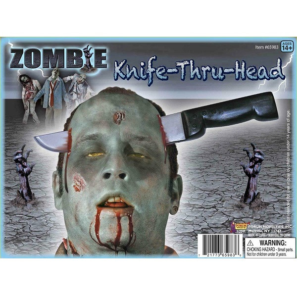 Add some fake blood and makeup to this Zombie Knife-Thru-Head Prop for a horrifying look! This headband features a plastic blade tip and handle on each end. One size fits most.