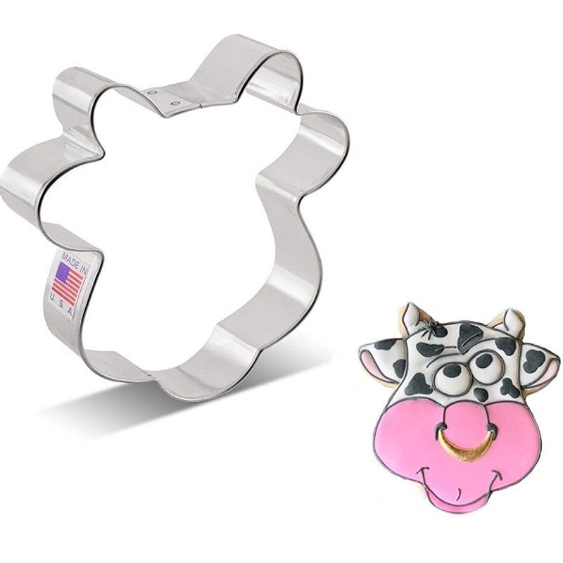 This Cow Face Cookie Cutter makes fun cookies for little ones that like farms! This sturdy metal cutter features a cute cow face shape. Measures approximately 4in x 3.75in.