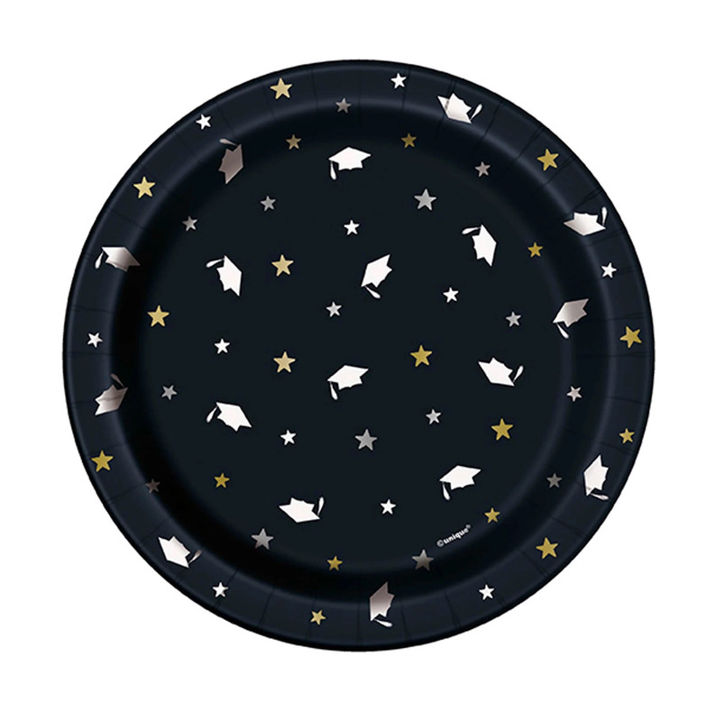Serve up sweet treats in style with these Stars and Caps Graduation Dessert Plates! Featuring a black background, these paper plates are adorned with a festive pattern of white graduation caps and gold and silver stars. Package includes 8 count plates measuring 6.75in.