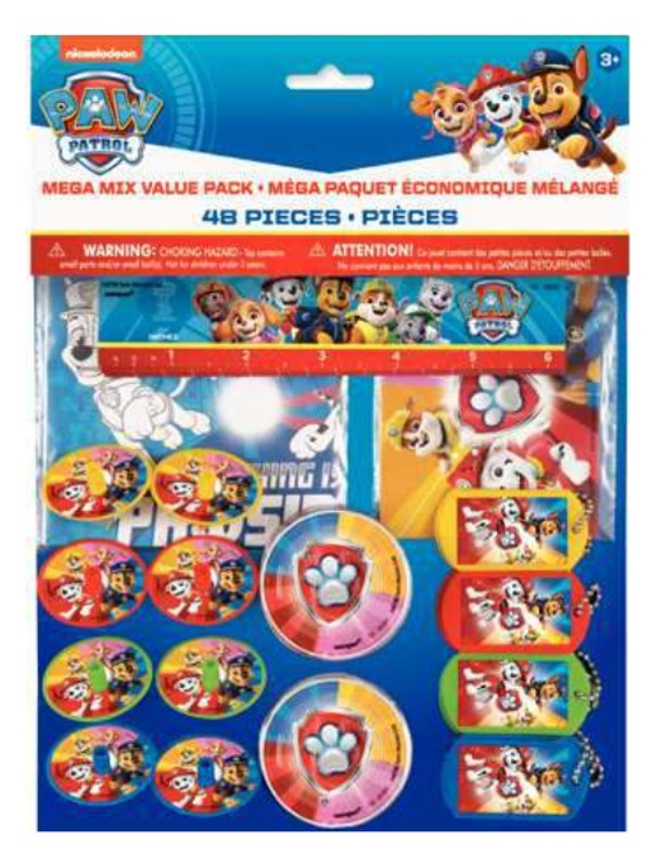 Get ready for a paw-some party with this Paw Patrol Favor Pack! Perfect for filling loot bags, this set includes a variety of fun Paw Patrol-themed goodies. Package includes 8 activity sheets, 8 paper rulers showcasing the the team, 8 spin tops and 8 dog tags in yellow, red, green, and blue, 8 maze games, and 8 sticker sheets.