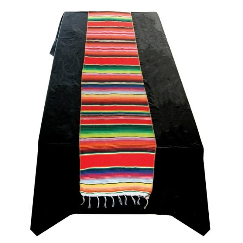 Add some fiesta flair to your Cinco de Mayo party table with this Serape Stripe Mexican Table Runner! This woven fabric runner features bright colorful stripes with attached white tassel fringe along the short edges. Black tablecover not included. Measures 14in x 108in.