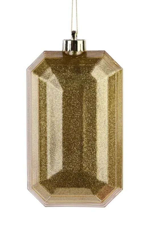 Add sparkle to your holiday decor with this Gold Glitter Rectangular Gem Ornament. This faceted rectangular shaped plastic ornament is glitter gold with a gold cap and hanger. Measures 7in x 4in x 2.75in.