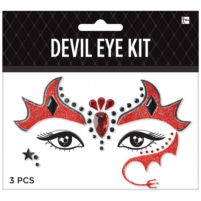 Add a fiery touch to your look with the Devil Eye Kit. Featuring a mix of red and black gems, along with horns and a pitchfork shape, this glittery sticker set is easy to apply and remove with soap and warm water. For best results, avoid using on sensitive skin. 1 set includes 3 pieces: 1 forehead piece and 2 under eye pieces.
