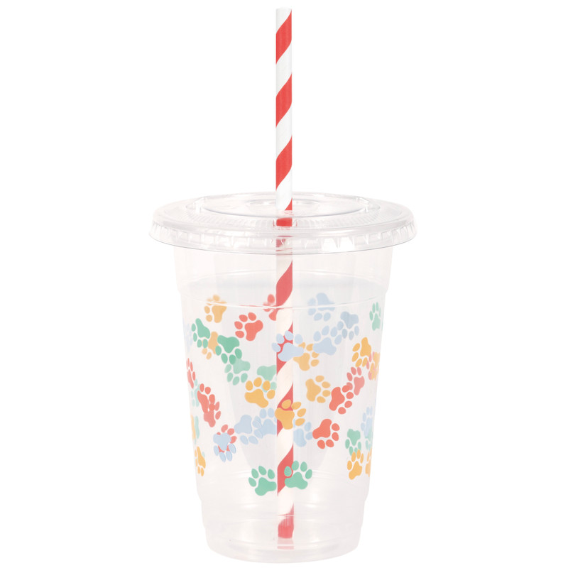 Turn up the fun with these Pawty Animal Party Cups with Straws and Lids. Made from clear plastic with a printed design of colorful pawprints, these cups come with plastic lids as well as striped paper straws in white stripes and red, grey, seafoam blue, and orange stripes. Package includes 8 count cups, measuring 16oz, with lids and straws.