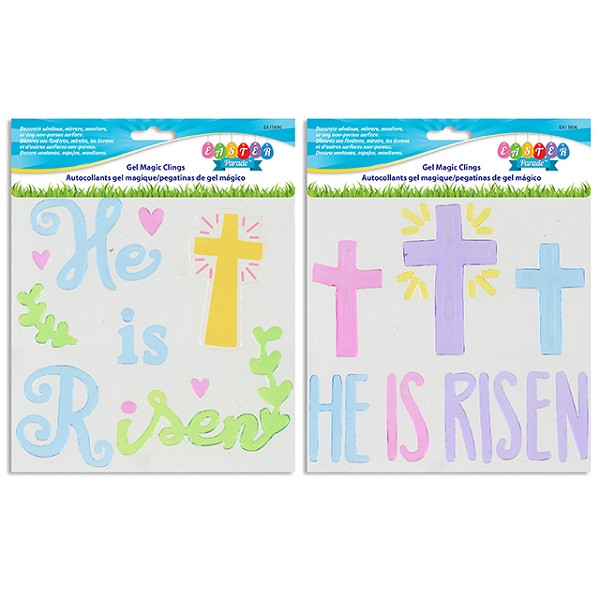 Add some divine style to your window with this Easter Religious Window Gel Cling! This colorful cling features He Is Risen in gel cling letters with cross accents. Includes 1 7.5in x 7.5in cling decoration, style may vary.