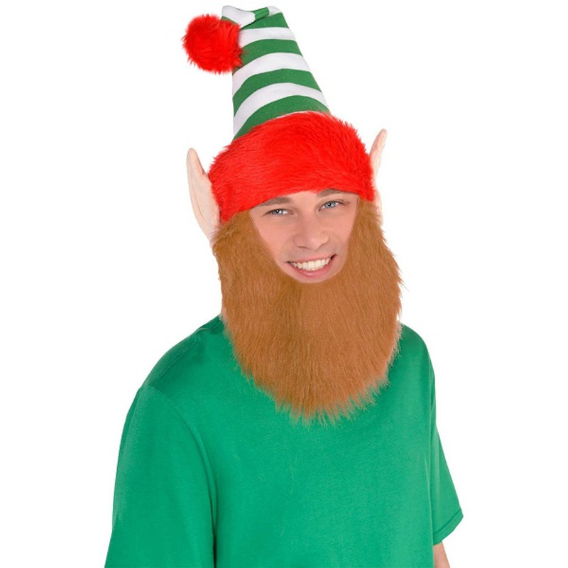 Transform into a Christmas elf for the holidays with this fun Elf Hat & Beard! This set features a green and white hat with red fuzzy trim and a red pom pom, elf ears, and a brown beard. Measures 24in x 12in. One size fits most.