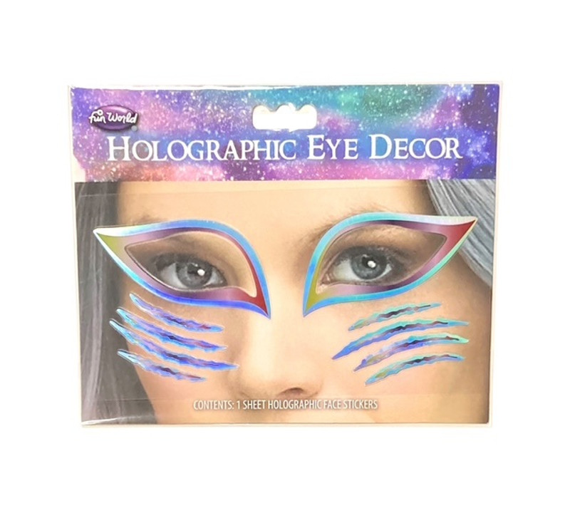 Add some sparkle to your look with the Holographic Eye Decor set. This collection includes 2 holographic cat eye-shaped stickers designed to accent the area around the eyes, along with eight scratch-like shapes. Package includes 1 set of stickers.