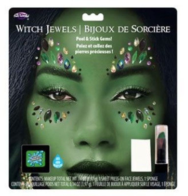 Stand out with these Witch Face Jewels and Makeup. These peel and stick jewels include circles, tear drops, and marquise shaped jewels of different sizes with the color scheme of green, black, and purple, the perfect accent for a variety of magical costumes. It also includes a makeup tray, green lipstick, and an applicator. Meant for 1 time use.