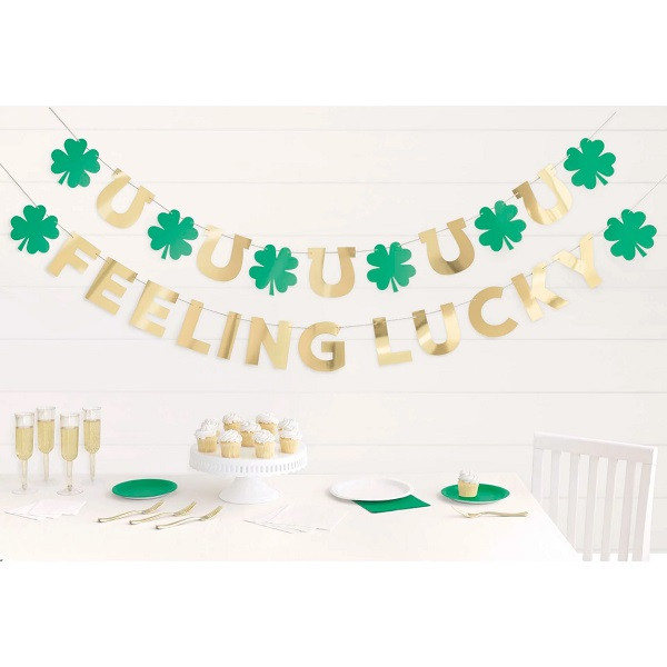 Decorate your St. Patricks Day party with this Feeling Lucky Garland Set! This set features lucky horseshoes, shamrocks, and spells out Feeling Lucky in gold foil letters. Package includes 2 9ft garlands.
